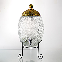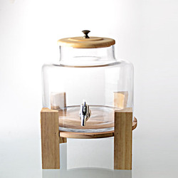 موزع مشروبات زجاجي مصنوع يدويًا عالي الجودة مع غطاء خشبي وحامل بعلبة تصميم مستدام